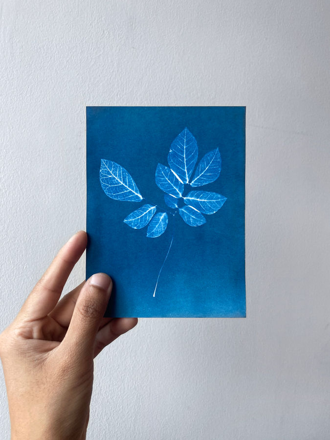 Printed with sunlight- creating ethereal Prussian blue images using elements from nature.
